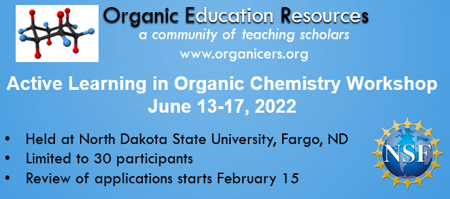 Applications are now open for the 2022 Active Learning in Organic Chemistry Workshop. This year our workshop will be back in person, at North Dakota State University in Fargo, ND from June 13 through 17. Enrollment in this workshop will be limited to 30 participants to promote collaborative activities and community building for a diverse group of faculty. Experienced members of the OrganicERs Leadership Board will introduce and facilitate implementation of evidence-based instructional methods. You are encouraged to apply. You can find more information about the workshop and the application form at https://forms.gle/P6MVGpLcw8ePVWeVA