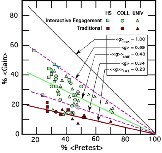 Figure 1. Pretest versus post-test gain for traditional and interactive engagement (active learning) courses.